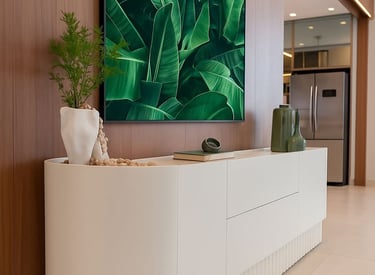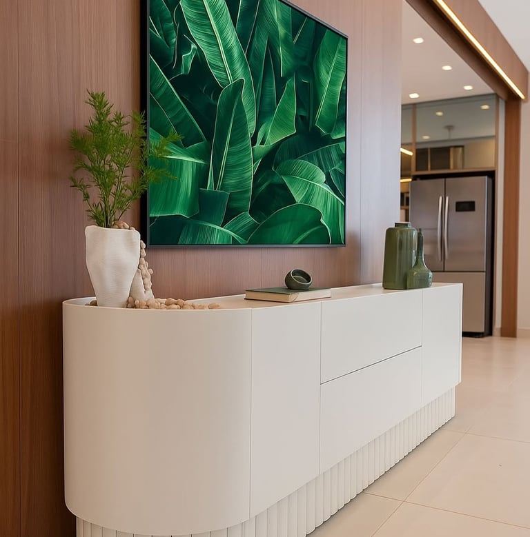The leafy artwork brings the space closer to nature, enhancing the beauty of the wood panel even more. The highlight goes to the stunning sideboard with soft curves and slatted base.