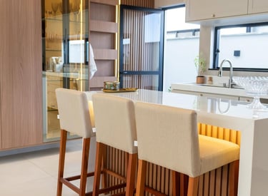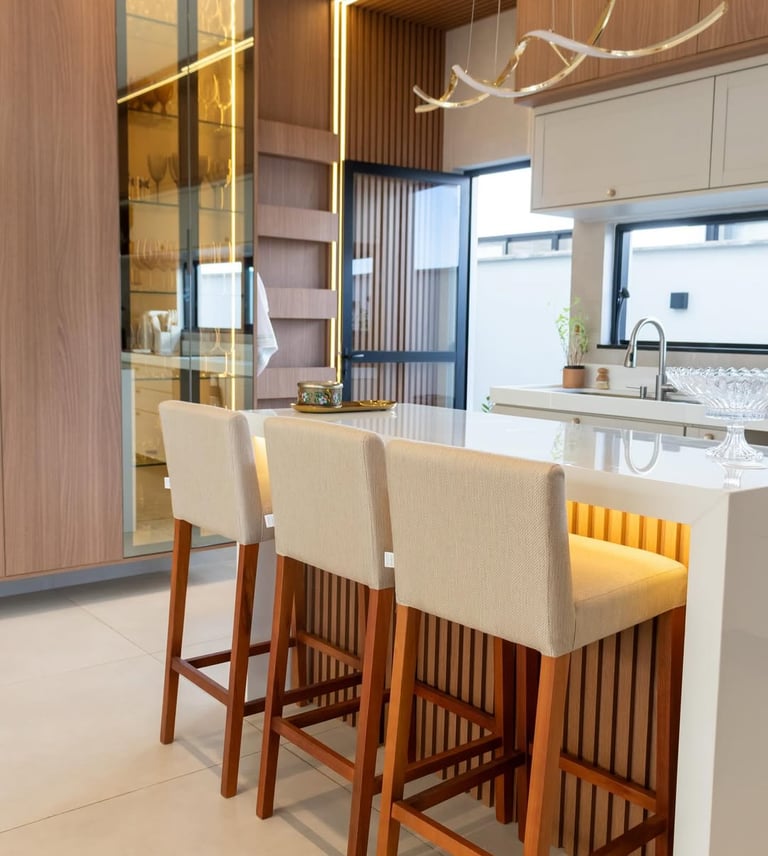 A super cozy kitchen where classic meets modern. Shaker-style cabinet doors blend harmoniously with wood-paneled and slatted accents, and the LED strips in the ceiling add the perfect finishing touch.