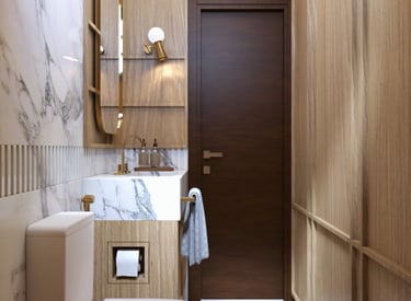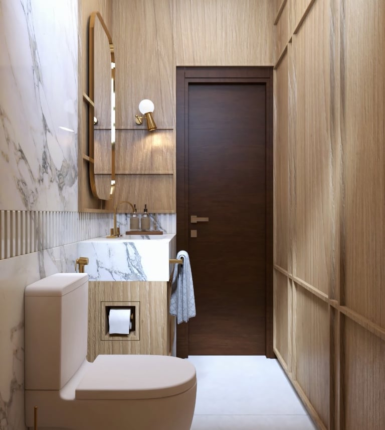 Powder room with warm wood tones and grooves that elevate the design with sophistication.
